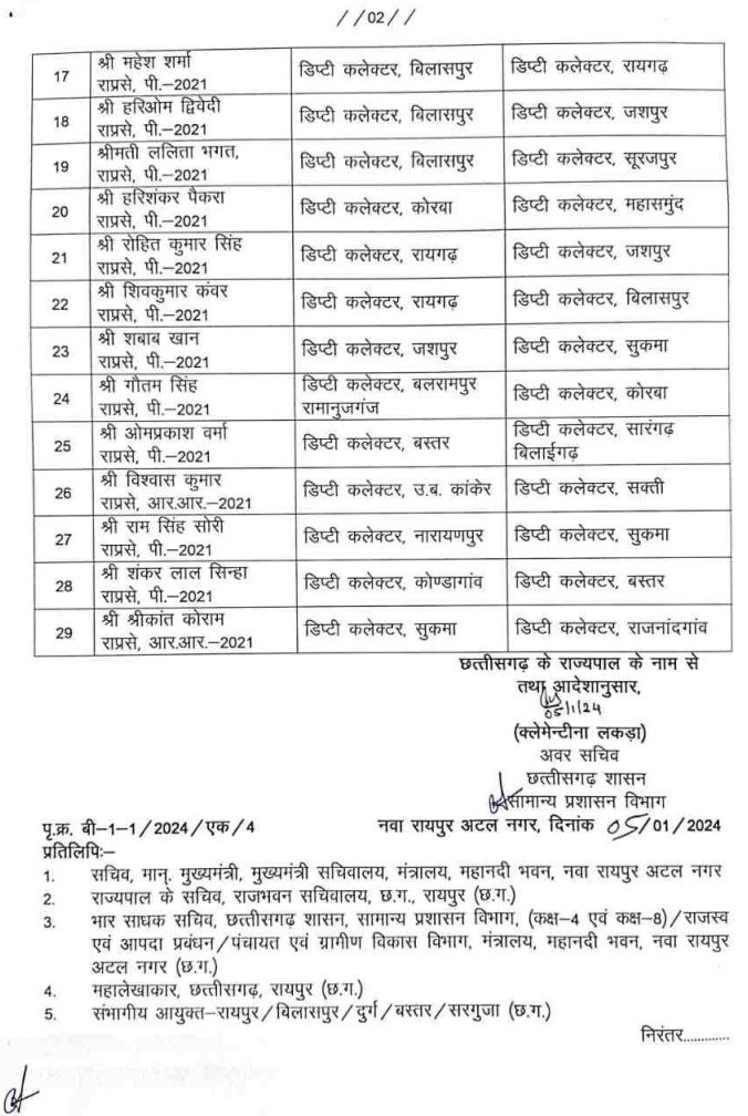 छत्तीसगढ़: राज्य सरकार ने आज बड़ी संख्या में जिला पंचायत सीईओ, ज्वाइंट कलेक्टर और डिप्टी कलेक्टरों का ट्रांसफर किया है। और एक साथ 29 अफसरों के तबादले किये गये हैं। देखिये पूरी लिस्ट-
