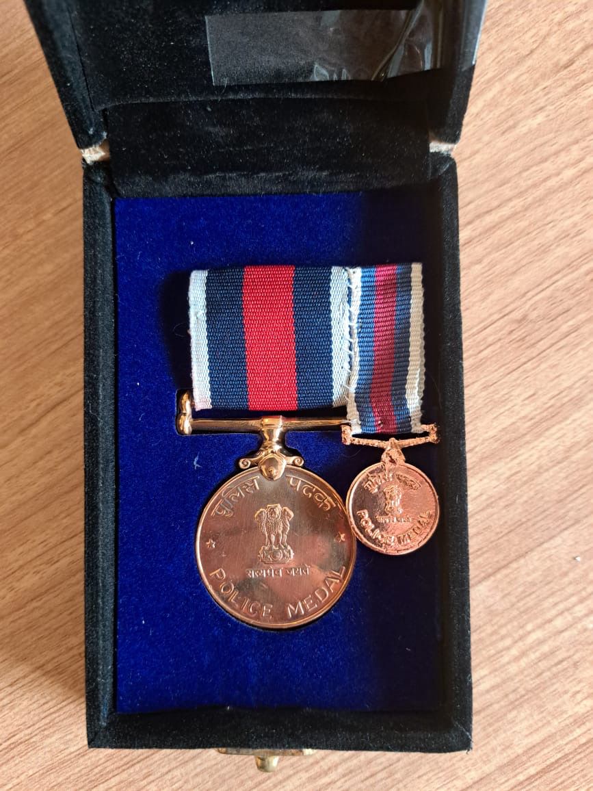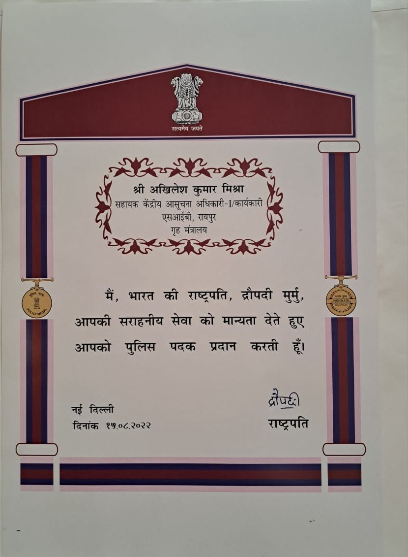 पदस्थ सेवा निवृत श्री अखिलेश कुमार मिश्रा सहायक केंद्रीय आसूचना अधिकारी को सराहनीय सेवा कार्य से जयपुर राजस्थान में गृहमंत्री अमित शाह के हाथों 5 जनवरी 2024 को राष्टपति पुलिस पदक व प्रस्सति पत्र देकर सम्मानित किया