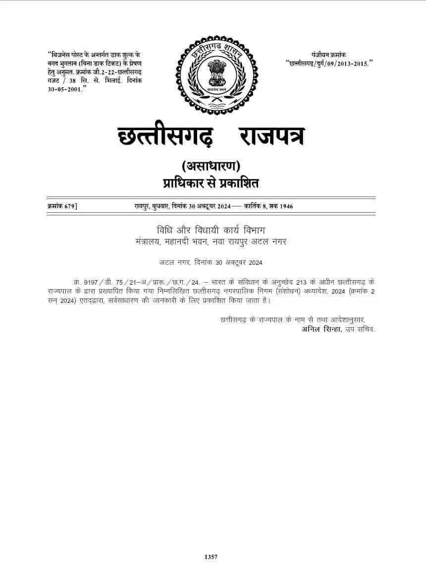 रायपुर। छत्तीसगढ़ सरकार ने नगर पालिका अधिनियम में बदलाव की अधिसूचना जारी कर दी है, जिसके तहत अब राज्य में महापौर चुनाव प्रत्यक्ष प्रणाली से होंगे। यह फैसला राज्य सरकार की पिछली कैबिनेट बैठक में लिया गया था, और अब इस संबंध में आधिकारिक अधिसूचना जारी कर दी गई है।