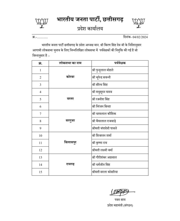रायपुर। भारतीय जनता पार्टी छत्तीसगढ़ के प्रदेश अध्यक्ष किरण देव के निर्देशानुसार आगामी लोकसभा चुनाव के लिए निम्नलिखित लोकसभा के पर्यवेक्षकों की नियुक्ति की गई है जो निम्नानुसार है –