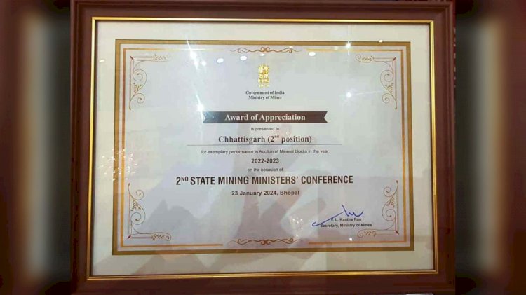 रायपुर: छत्तीसगढ़ राज्य को गैर कोयला मुख्य खनिज ब्लॉकों की नीलामी के लिए एक और राष्ट्रीय पुरस्कार मिला है। केन्द्रीय कोयला एवं खान मंत्री प्रहलाद जोशी ने आज मध्यप्रदेश की राजधानी भोपाल में आयोजित राज्य खनन मंत्री सम्मेलन में गैर कोयला मुख्य खनिज ब्लॉकों की सफलतापूर्वक नीलामी के लिए छत्तीसगढ़ को देशभर में द्वितीय बेस्ट परफॉर्मेंस अवार्ड से नवाजा है। यह पुरस्कार भारत सरकार के खनन मंत्रालय द्वारा दिया गया है। मुख्यमंत्री विष्णु देव साय ने इस उपलब्धि के लिए खनिज विभाग के सभी अधिकारियों को बधाई और शुभकामनाएं दी हैं।