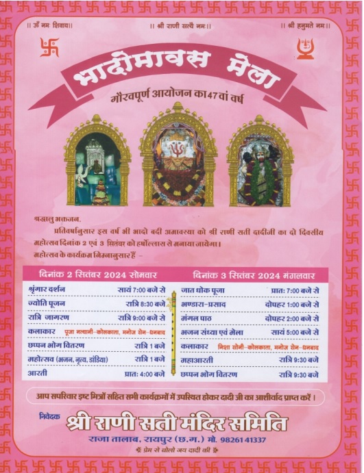 रायपुर। प्रतिवर्षानुसार इस वर्ष भी भादो बदी अमावस्या को श्री रानी सती दादी जी का महोत्सव 2 व 3 सितंबर 2024 को हर्षोल्लास के साथ मनाया जाएगा। मंदिर समिति के अध्यक्ष किशोर ड्रोलिया ने बताया की राजा तालाब स्थित मंदिर में 2 सितंबर 2024 दिन सोमवार को शाम 7 बजे से दादीजी का नयनाभिराम श्रृंगार का दर्शन होगा। रात्रि 08:30 बजे ज्योति पूजन के बाद रात्रि 9 बजे से आमंत्रित भजन गायक पूजा नतथानी एंड पार्टी, कोलकाता, मनोज सेन एण्ड पार्टी, धनबाद द्वारा भजन संकीतन कर रात्री जागरण होगा। रात्रि 1 बजे को छप्पन भोग का प्रसाद वितरण होगा एवं मंगला आरती सुबह 4 बजे होगा।