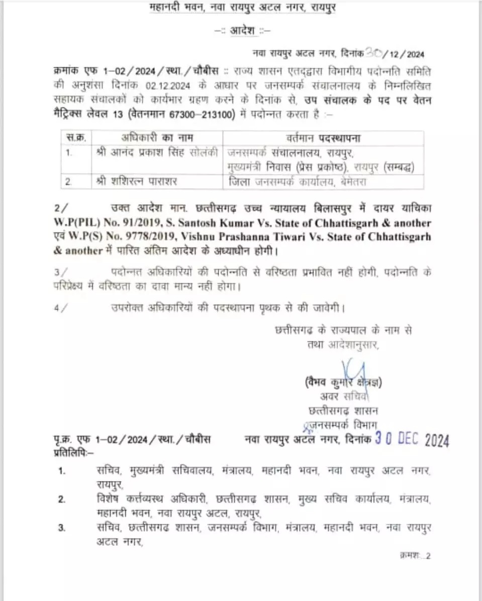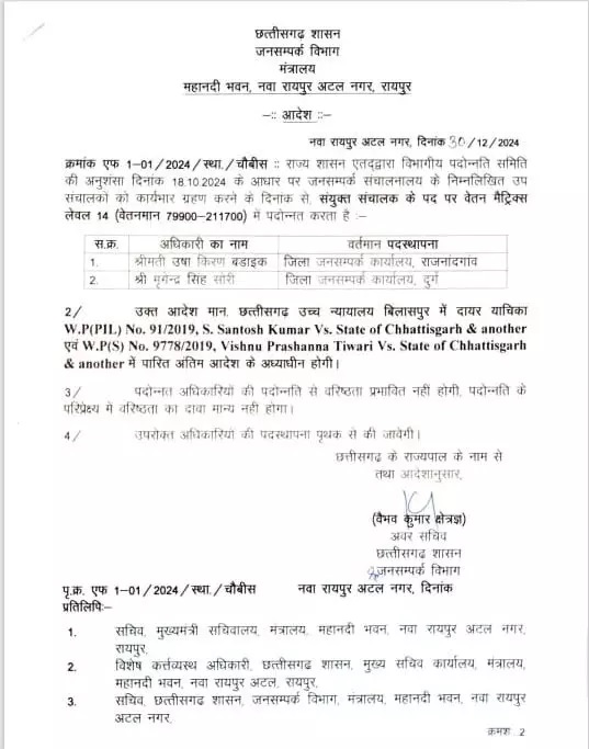 रायपुर। जनसंपर्क विभाग के अफसरों का प्रमोशन हुआ है। दो सहायक संचालकों को जहां उप संचालक के पद पर पदोन्नति दी गई है, वहीँ दो उप संचालकों को संयुक्त संचालक बनाया गया है। आनंद प्रकाश सोलंकी और शशि रत्न परासर जहां सहायक संचालक से उप संचालक के पद पर पदोन्नति दी गयी है, जबकि उषा किरण और मृगेंद्र सिंह सोरी को उप संचालक से संयुक्त संचालक बनाया गया है।