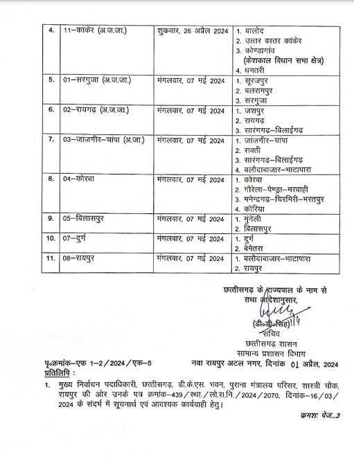 राज्य में मतदान के दिन अवकाश रहेगा। इस संबंध में सामान्य प्रशासन विभाग ने आदेश जारी कर दिया है। 19 अप्रैल को जहां बस्तर लोकसभा क्षेत्र में छुट्टियां रहोगी, वहीं दूसरे चरण के लोकसभा चुनाव में 26 अप्रैल को राजनांदगांव, महासमुंद और कांकेर में छु्टटी होगी। जबकि 7 मई को सरगुजा, रायगढ़, जांजगीर-चांपा, कोरबा, बिलासपुर, दुर्ग और रायपुर लोकसभा के तहत आने वाले जिलों में छुट्टी होगी।