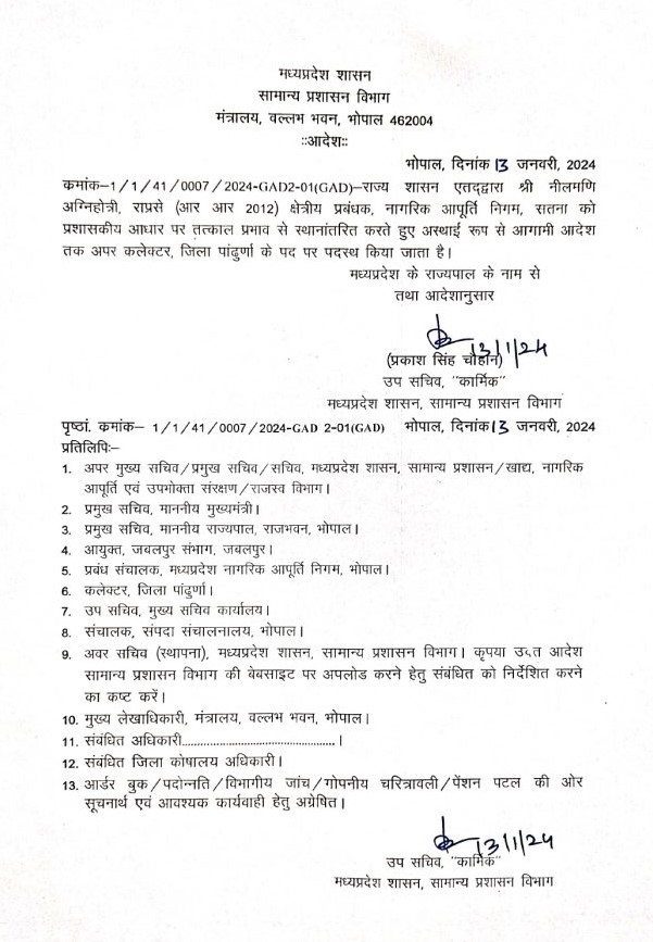नीलमणि अग्निहोत्री बने पांढुर्ना के अपर कलेक्टर, आदेश जारी…
