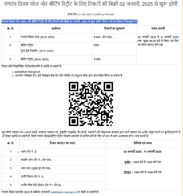 गणतंत्र दिवस परेड 2025 और बीटिंग रिट्रीट के लिए टिकटों की बिक्री 02 जनवरी, 2025 से शुरू होगी। टिकट दरों का विवरण निम्नानुसार है: