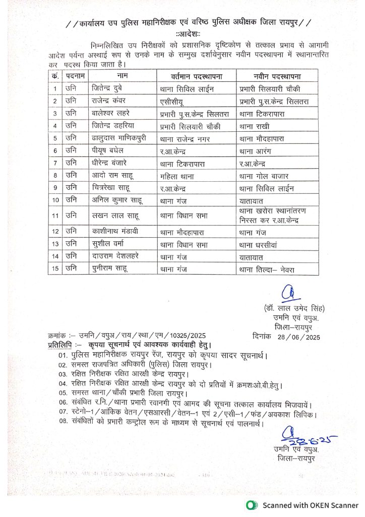 रायपुर जिले के पुलिस विभाग में तबादला हुआ है. प्रशासनिक दृष्टिकोण से बड़ी संख्या में सब इंस्पेटर और असिस्टेंट सब इंस्पेटर इधर से उधर हुए हैं. इस संबंध में रायपुर SSP डॉ. लाल उमेद सिंह ने आदेश जारी किया है. जारी लिस्ट में कुल 77 पुलिस अधिकारियों के नाम शामिल है. ट्रांसफर में शामिल कई अधिकारी पिछले कई सालों से एक ही थाने में जमे हुए थे