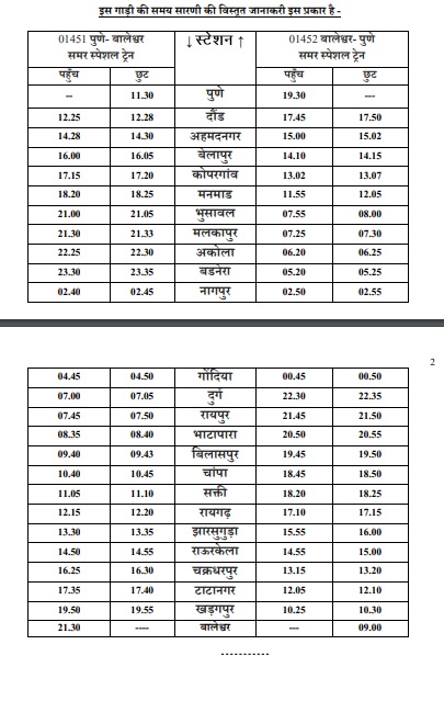01451 पुणे-बालेश्वर समर स्पेशल दिनांक 18 मई, 2024 को शनिवार को पुणे से रवाना होगी । इसी प्रकार विपरीत 01452 बालेश्वर-पुणे समर स्पेशल दिनांक 20 मई, 2024 सोमवार को बालेश्वर से रवाना होगी । इस गाड़ी में कुल 22 कोच उपलब्ध रहेंगे ।