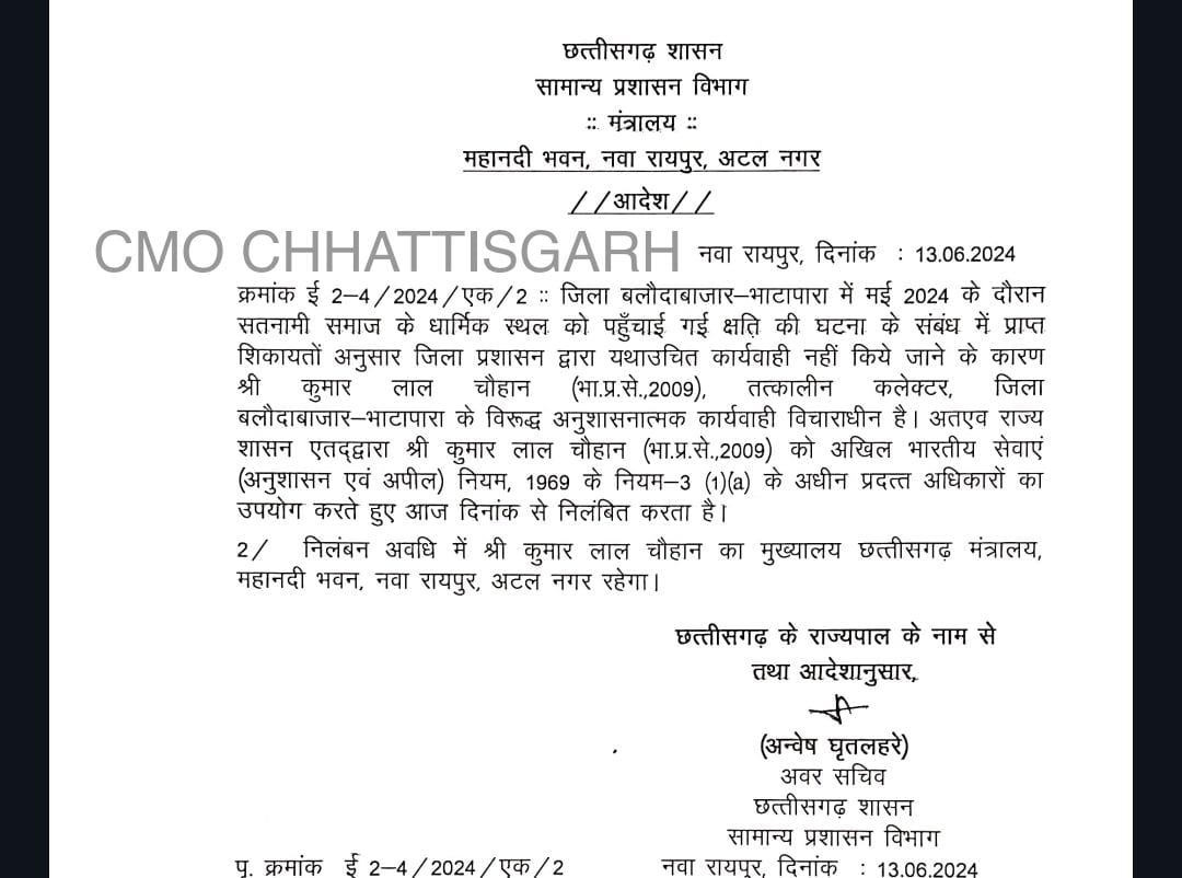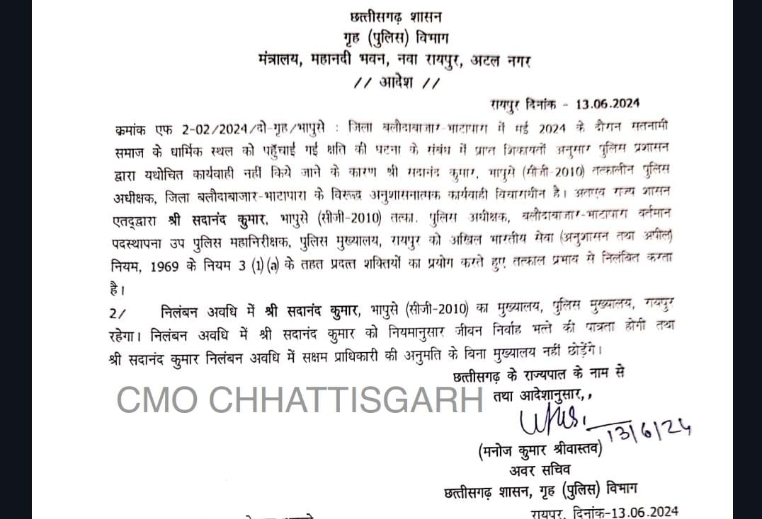बलौदबाजार हिंसा मामले पर राज्य सरकार ने तत्कालीन कलेक्टर के एल चौहान और एसएसपी रहे सदानंद को निलंबित कर दिया है। बुधवार को ही कलेक्टर और एसएसपी का तबादला कर दिया था। बताया जा रहा है कि घटना की प्रारंभिक रिपोर्ट आने के बाद सरकार ने निलंबन की कार्रवाई की है।