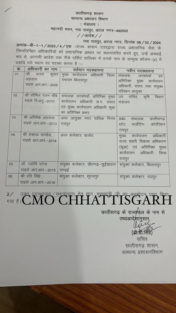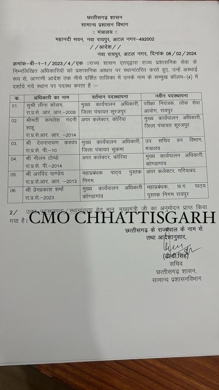 सूरजपुर के संयुक्त कलेक्टर रवि सिंह को रायपुर का संयुक्त कलेक्टर बनाया गया हैं। वहीं, सूरजपुर CEO लीना कोसम को परीक्षा नियंत्रक, लोक सेवा आयोग रायपुर में पदस्य किया गया हैं। इसके अलावा, कोरिया अपर कलेक्टर कमलेश नंदनी साहू को सूरजपुर CEO बनाया गया हैं।