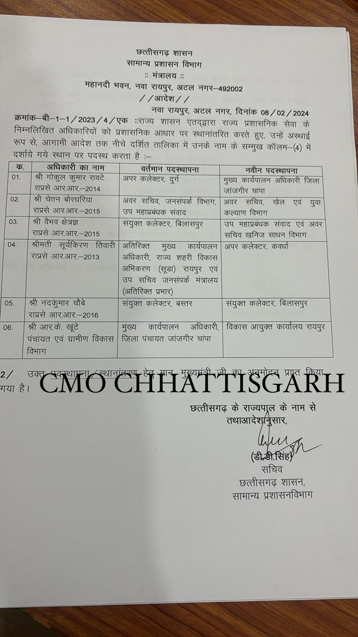 chhattisgarh: छत्तीसगढ़ में मुख्यमंत्री विष्णुदेव साय सरकार के गठन के बाद अफसरों के तबादले का दौर जारी हैं। राज्य सरकार ने IAS और IPS अधिकारियों के तबादले के बाद अब राज्य प्रशासनिक सेवा के 18 अधिकारियों को ट्रांसफर किया गया हैं। यह अधिकारी अलग-अलग जिलों में संयुक्त कलेक्टर, अपर कलेक्टर, जिला सीईओ, आयुक्त, महाप्रबंधक के पद पर पदस्य थे, जिन्हें अब दूसरे जिलों में भेजा गया हैं।