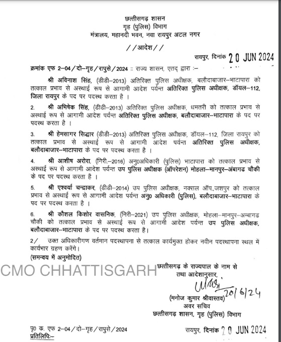 रायपुर। पुलिस विभाग में एएसपी और डीएसपी के तबादले किये गये है। देखें लिस्ट