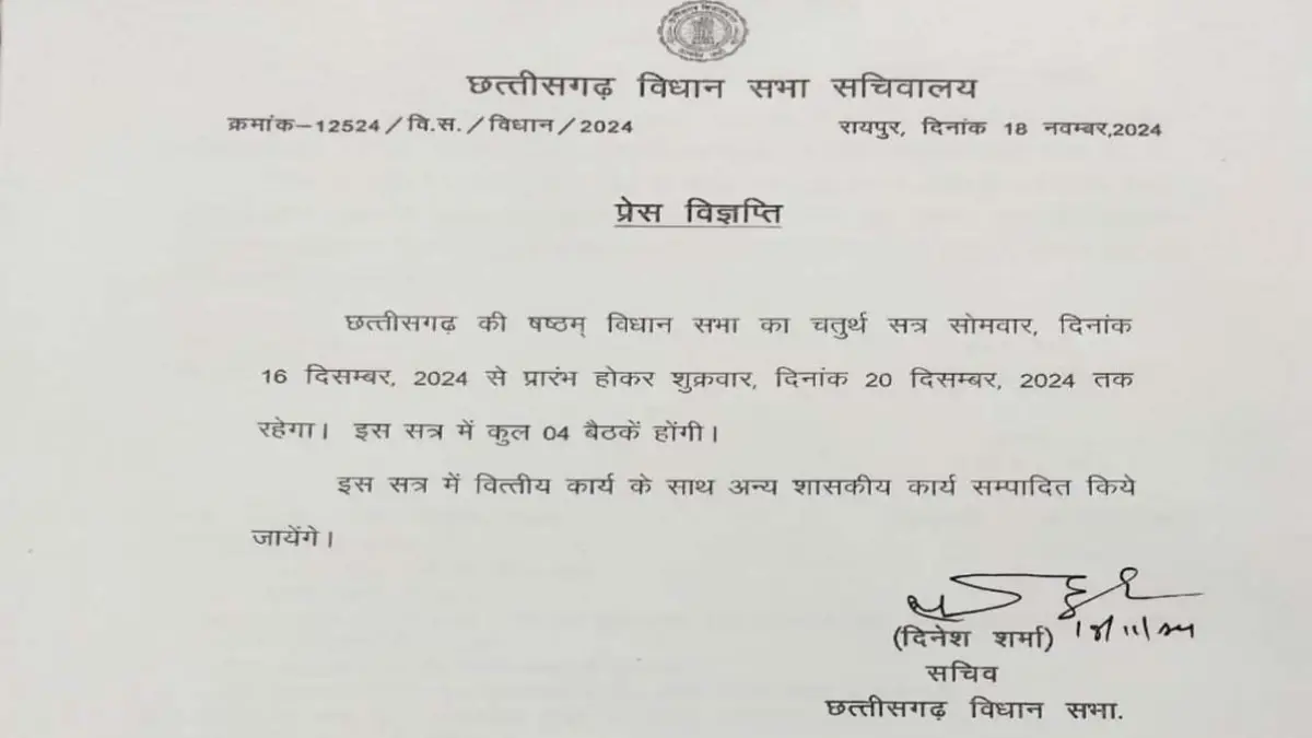 रायपुर। छत्तीसगढ़ विधानसभा का शीतकालीन सत्र 16 दिसंबर से शुरू होगा। विधानसभा सचिवालय की ओर से इसके लिए नोटिफिकेशन जारी कर दिया गया है। नोटिफिकेशन के मुताबिक, विधानसभा का शीतकालीन सत्र 16 दिसंबर से शुरू 20 दिसंबर तक चलेगा। इस दौरान 4 बैठकें होंगी।